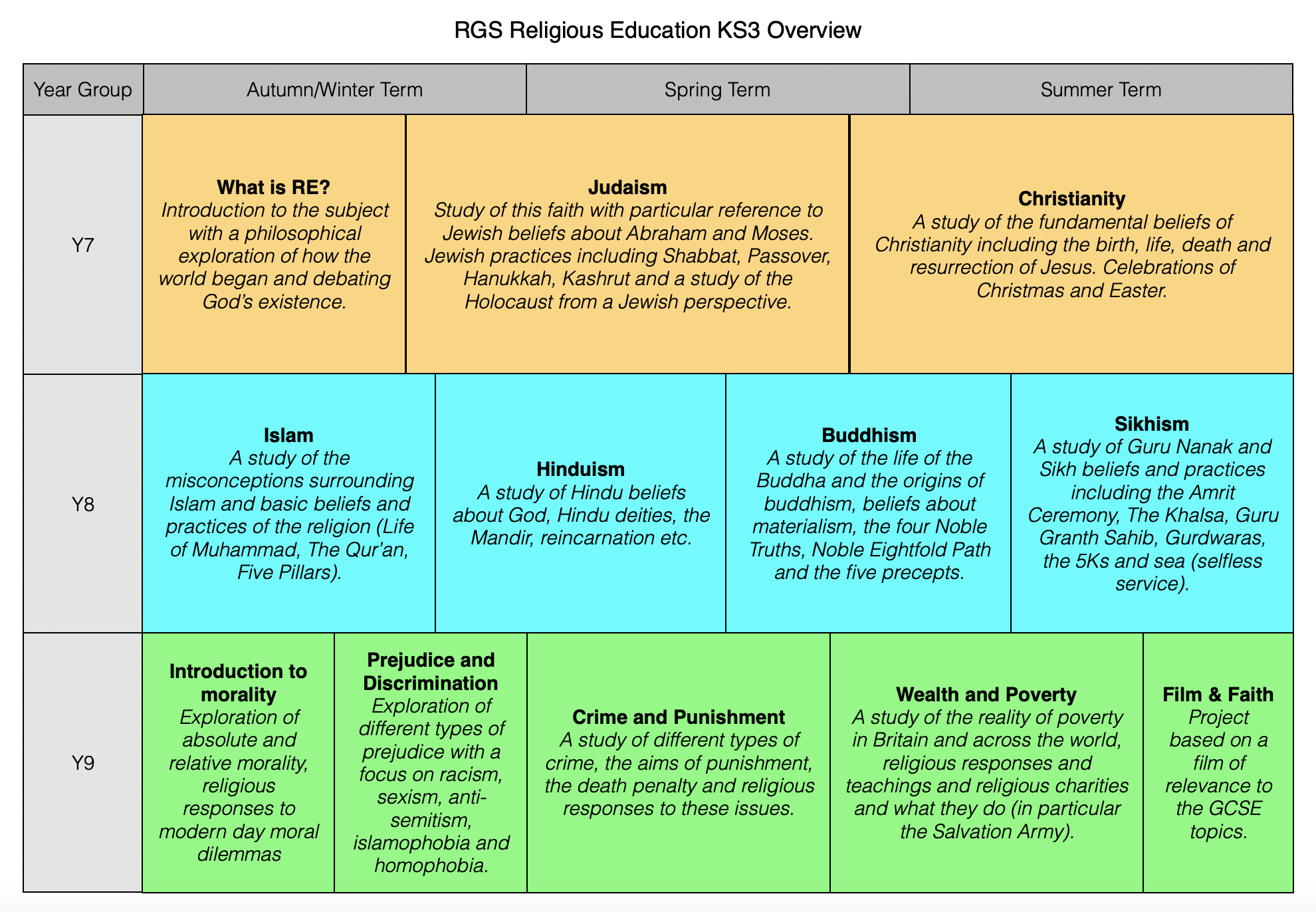 At KS3 RGS students will study a balance of the major world faiths as well as an exploration into the moral issues of prejudice and discrimination, crime and punishment and wealth and poverty. Attached is an overview of our KS3 topics.